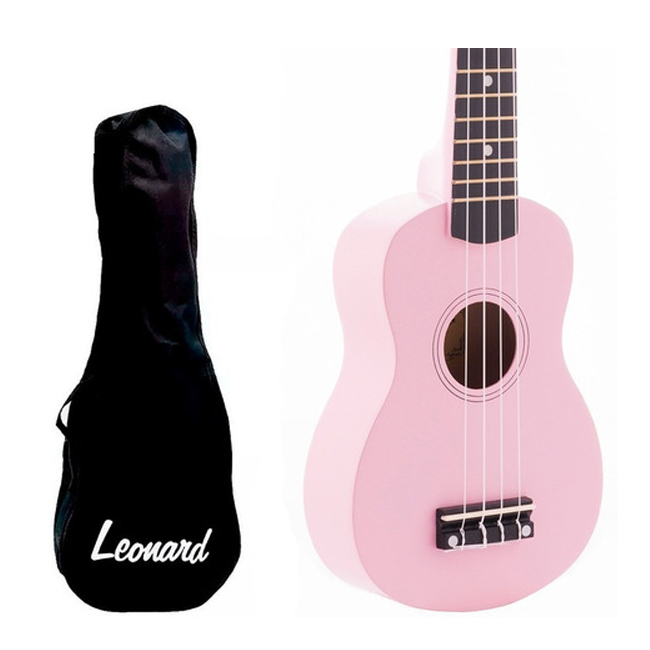 Ukelele Leonard UK5 color rosa con funda, pua y cuerda