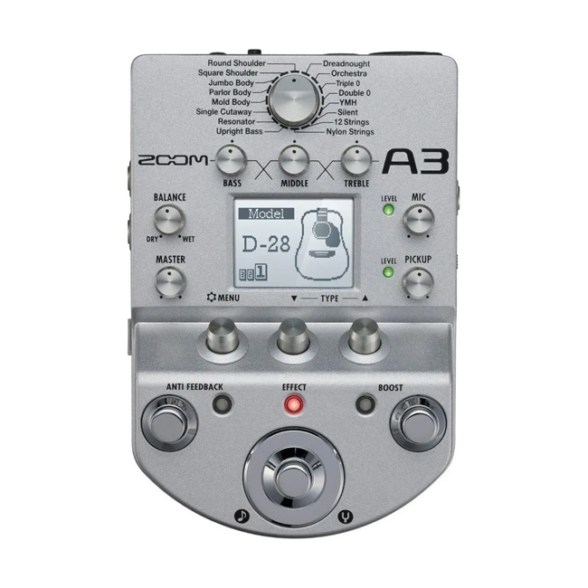 Características principales Marca Zoom Modelo A3 Otras características Voltaje de funcionamiento: 9V Instrumentos compatibles: Guitarra acústica Tecnología: Digital Incluye fuente de alimentación: No Incluye pedal de expresión: No Es pedal multiefecto: Sí Cantidad de efectos: 68 Tipos de efectos: Multi-effects Ancho x Profundidad x Altura: 108 mm x 160.3 mm x 54.9 mm Peso: 640 g Descripción Zoom A3 Reproducir el delicado tono de una guitarra acústica en el escenario puede ser un desafío. Los pickups tienen una tendencia a hacer que el sonido sea plano y sin vida, mientras que los micrófonos a menudo presentan retorno. La Zoom A3 proporciona la solución perfecta. Este pedal de preamplificación / efectos compacto proporciona todo lo que necesita para restaurar y mejorar el tono natural de su instrumento, o incluso transformarlo en uno de sonido diferente. Las potentes características de remodelación combinadas con efectos de gran sonido y funciones avanzadas como supresión de realimentación, afinador cromático automático, ecualización de 3 bandas y un interruptor de pie Clean Boost convierten al A3 en la caja de herramientas sonora completa para guitarra acústica. Características: • El preamplificador de alta calidad se puede usar tanto con pickups como con micrófono • Diseño de muy bajo ruido • Ecualizador gráfico de 3 bandas • Modelado acústico para la restauración del tono del cuerpo incluso cuando se utiliza una pastilla • Remodelación de preajustes para 16 tipos de cuerpo y 28 modelos populares de guitarra acústica • 40 efectos especialmente diseñados para guitarra acústica, incluyendo compresión, ecualización, modulación, retardo y reverberación • Se pueden usar hasta 3 efectos simultáneamente, en cualquier orden • 20 ubicaciones de memoria para el almacenamiento de parches creados por el usuario • Pantalla LCD retroiluminada con control de contraste para una fácil visualización en entornos con poca luz • Patcheado • Detección y eliminación de retroalimentación automática • Interruptor de pie Clean Boost para hasta 12 dB de ganancia adicional • El afinador cromático incorporado soporta todas las afinaciones de guitarra estándar, incluidas las afinaciones abiertas y soldadas • Rango del sintonizador de 435 - 445 Hz • Tap Tempo para sincronización de tiempos de retardo o tasas de modulación • Función de guardado automático para el guardado automático de todos los parámetros de parche • Entrada de recogida estándar de ¼ "con interruptor de compensación de recogida de tres vías • Entrada Combo XLR / TRS Mic / Line con alimentación phantom y inversión de fase • Controles de sensibilidad de entrada, balance y nivel maestro • Tomas de salida dobles de ¼ "para la conexión a PA y auriculares • Salida balanceada XLR con elevación de tierra para conexión DI • Puerto USB para actualizaciones de firmware • El robusto cuerpo fundido a presión garantiza la inspección técnica • Lo suficientemente pequeño como para caber en su funda de guitarra o bolso de concierto • Fácilmente integrado en cualquier pedalboard existente • Funciona con 4 pilas AA, con una duración de la batería alcalina de hasta 8 horas