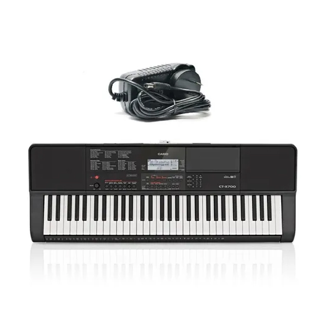 Teclado Casio Organo Ct-x700 Sensitivo 5 Octavas Fuente CASIO CT-X700 Con la revolucionaria tecnología de producción de sonido AiX y una variedad de nuevos ritmos y tonos, el CT-X700 es perfecto para iniciarse en el nuevo mundo del teclado CT-X. Equipado con el nuevo controlador de ritmo Synchro Stop, la función Tap Tempo y el botón Registration Freeze, el CT-X700 ofrece multitud de posibilidades. Tanto principiantes como avanzados podrán crear melodías de baile con ritmos fascinantes y reproducir fácilmente tonos realistas de instrumentos acústicos en jam sessions. Descripción completa Especificaciones Cuerpo Dimensiones: 948 x 350 x 109 mm Peso: 4.3 Kg Color: Negro Teclado Número de teclas: 61 Respuesta táctil: 3 tipos, off Botón Touch On/Off: Sí Tecnología: AiX Tamaño LCD: 108 x 38mm Tonos y efectos TonOs: 600 Polifonía máxima: 48 (24 para ciertos tonos) Capas: Lower, Upper1, Upper2 Tipo de sistema de reverb: 20 tipos Tipo de sistema de coro: 10 tipos Tipo de sistema de delay: 15 tipos Ritmos: 195 Metrónomo: Sí Beats por compás: 0 a 9 Tempo Range: 20 a 255 Arpegiador: 100 tipos Music Preset: 310 tipos Canciones y lecciones Canciones demo: 1 Canciones incluidas: 160 Canciones de usuario: 10 (máx. 320 Kb por canción) Canciones de usuario grabadas: 6 (máx. 320 Kb por canción) Lecciones: 3 (escucha, mira, recuerda), modo fácil Partes de la lección: L, R, LR Funciones: Repeat, Voice Fingering Guide, Note Guide, Performance Evaluation Ritmos integrados: 195 Ritmos de usuario: 10 (máx. 64 Kb por ritmo) Función libro de acordes¡: Manual de acordes Registro: 32 (4 set ups x 8 banks) Grabadora Grabación: Real-time, playback Grabador MIDI: Tracks, songs, memory capacity Pistas: 6 Canciones: 5 Tocar con canciones: 1 Song (L, R, LR) Capacidad de memoria: 40,000 notas (para cada canción) Otras funciones Transposición: /- 1 octava (-12 to 12 semitonos) Cambio de octavas: Upper 1/ Upper 2/ Lower, /- 3 octavas Afinación: A=415.5 to 465.9Hz (Initial Default: A=440.0Hz) Escalas preset: 17 Music Preset: 310 One Touch Preset: 195 Autoarmonización: 12 types Arpegiadorr: 100 types Función información musical: Tone, Rhythm, Song Bank numbers and names, staff notation, fingering, pedal operation, tempo, measure and beat number, chord name, etc. Conectividad Phones/ Salida: Sí Pedal: 1 Audio-In: Sí USB a Host: Sí MIDI: 16 multi-timbre received, GM Level 1 Standard Puerto USB: Tipo B PEDAL jack: Standard jack (sustain, sostenuto, soft, rhythm) Jack estándar estéreo Impedancia de entrada: 10kO Sensibilidad de entrada: 200mV Amplificadores y altavoces Amplificadores: 2.5W 2.5W Altavoces: 12cm x 2 Fuente de alimentación Fuented de alimentación: DC9.5V Batería: 6 pilas AA alcalinas Duración: 3 horas continuas con pilas Adaptador CC: AD-E95100L Auto Power Off: Aproximadamente 30 minutos después del último uso, puede apagarse Consumo de potencia: 9.5V, 7.5W