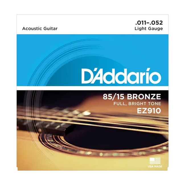 DAddario EZ910 85/15 Great American Bronze, Ligeras, 11-52 EZ910 Cadenas son un indicador de híbrido original de DAddario y un compromiso cómodo para reproductores que quieren la profundidad y proyección de luz calibre de Cadenas de fondo, pero ligeramente menos tensión en las Cadenas altas para fácil plegado. Descripción Completa 85/15 bronce combina el brillo de 80/20 bronce con las características de vida más largas de bronce de fósforo. El 85/15 bronce envoltura de cable es enrollado en un núcleo cuidadosamente elaborado, de forma hexagonal acero de alto carbono, resultando en un tono sonido brillante de larga duración, con entonación excelente precisión. Cuerdas, el fabricante más grande del mundo de las Cadenas del instrumento musical, es conocida como la elección de los instrumentistas con una reputación de insuperable calidad y consistencia. Embalaje innovador, respetuoso de d addario reduce el desperdicio y proporciona protección contra la corrosión. Todas las Cadenas d Addario son fabricadas en los Estados Unidos utilizando maquinaria patentada, controlada digitalmente, estado-of-the-art para un rendimiento inigualable, establecido después de la colocación. Características y especificaciones: Calibrador acústico más popular de d Addario, equilibrio ideal de tono y fácil de tocar Brillante, larga duración de tono acústico, ideal para todos los estilos musicales Embalaje ecológico y resistente a la corrosión para las Cadenas que son siempre frescas Hechos en los EEUU para la más alta calidad y rendimiento Medidores de cuerda: Acero llAño.011,.015, Bronce Entorchado.024.032,.042,.052 Un juego completo de cuerdas para guitarra acústica. Medidor de luz (.011-.052) Las cuerdas de la herida son redondas, hechas de bronce 85/15. Cuerdas desenrolladas son de acero liso. Cuerdas empaquetadas en bolsas de intercepción de corrosión para garantizar la frescura.